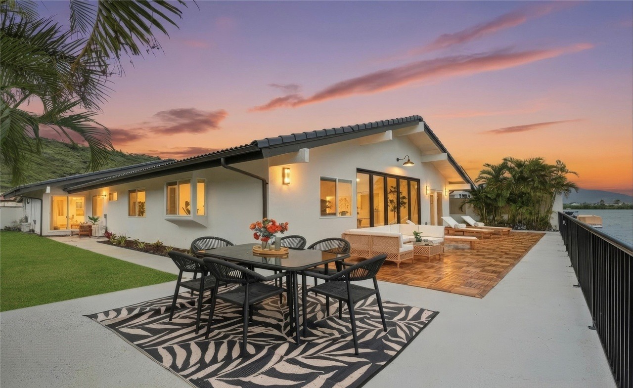 A stunning contemporary patio featuring a sophisticated outdoor dining setup with black woven chairs, decorative zebra-print rug, and concrete flooring, seamlessly integrated with a modern white residence and manicured landscape. The space exemplifies luxury coastal-modern living with abundant natural light, warm earthy tones, and an effortless indoor-outdoor flow enhanced by professional staging and photography.