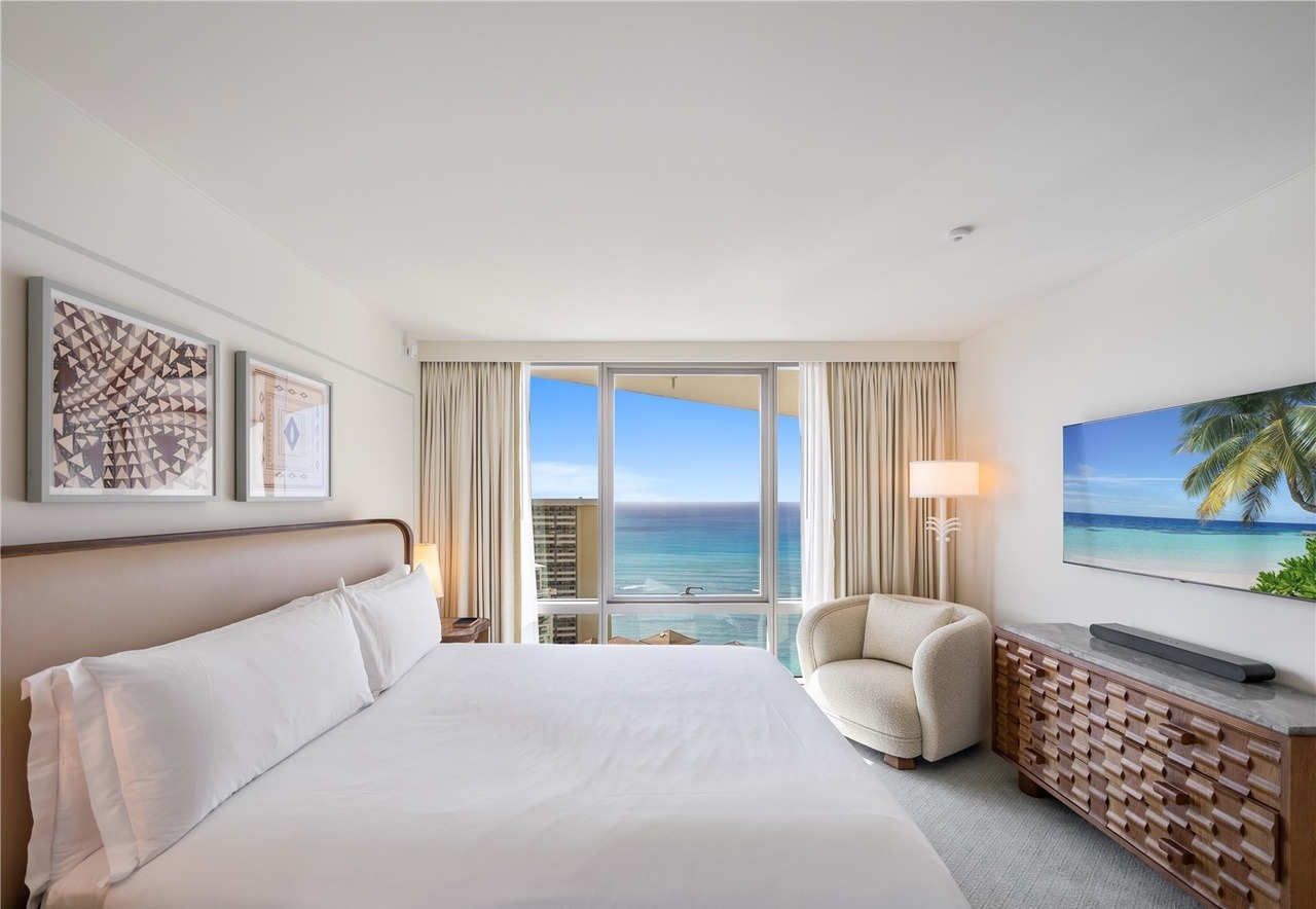 A stunning high-rise oceanfront primary bedroom featuring expansive floor-to-ceiling windows framing pristine turquoise waters, designed with a sophisticated coastal-transitional aesthetic. The serene palette of whites, beiges, and warm grays is anchored by a curved upholstered headboard, woven rattan dresser, and curated artwork, creating a luxurious yet inviting sanctuary with impeccable natural light and refined coastal elegance.