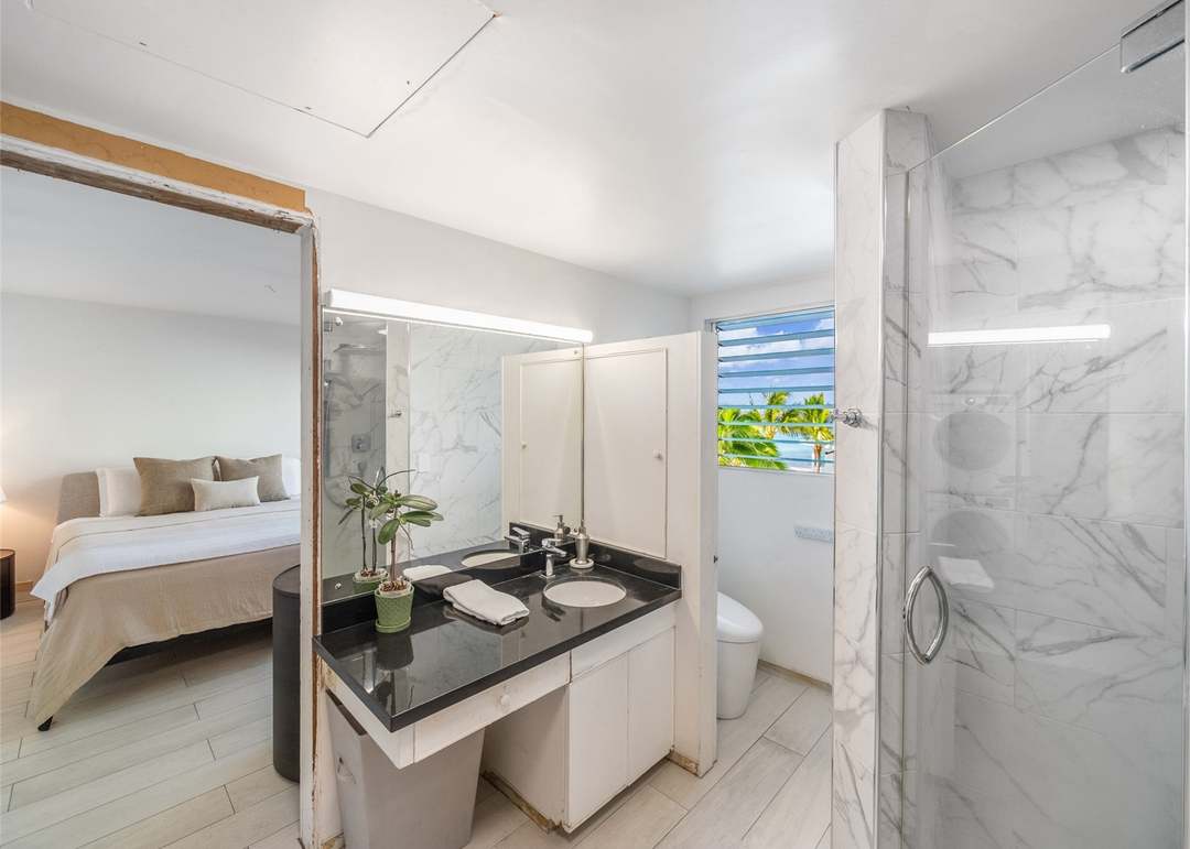 A sophisticated primary en-suite bathroom seamlessly integrated with the adjoining bedroom, featuring a floating white marble vanity with dual sinks, a spacious frameless walk-in shower with large-format marble tile, and abundant natural light from strategically placed windows. The cool-toned palette of white, gray, and black marble is warmed by natural wood framing and organic finishes, creating a serene, spa-like retreat with contemporary design sensibilities and impeccable attention to detail.