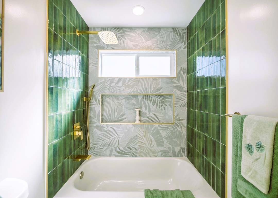 A sophisticated spa-inspired primary bathroom featuring verdant green vertical subway tiles paired with sophisticated patterned botanical wallpaper and large-format tiles in muted earth tones. The walk-in shower with frameless glass enclosure and rainfall showerhead, complemented by brass hardware and abundant natural light from a skyline window, creates a serene, luxurious retreat with a distinctly contemporary botanical aesthetic.