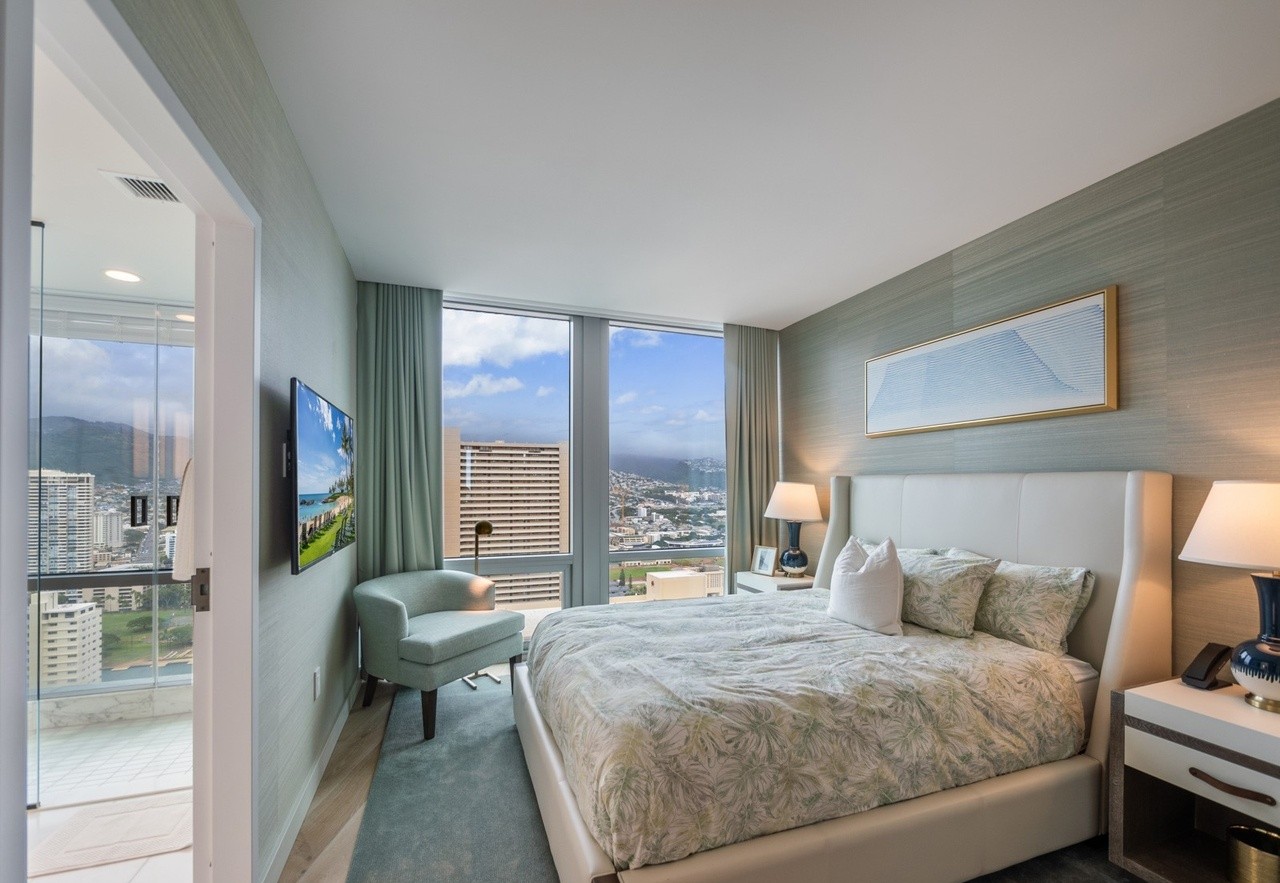 A stunning high-rise primary bedroom suite with floor-to-ceiling windows offering panoramic mountain and cityscape views, featuring a sophisticated palette of sage green walls, cream linens, and warm brass accents. The space exemplifies organic modern design through natural materials, soft textures, and a serene atmosphere enhanced by abundant natural light and careful attention to luxury detailing.
