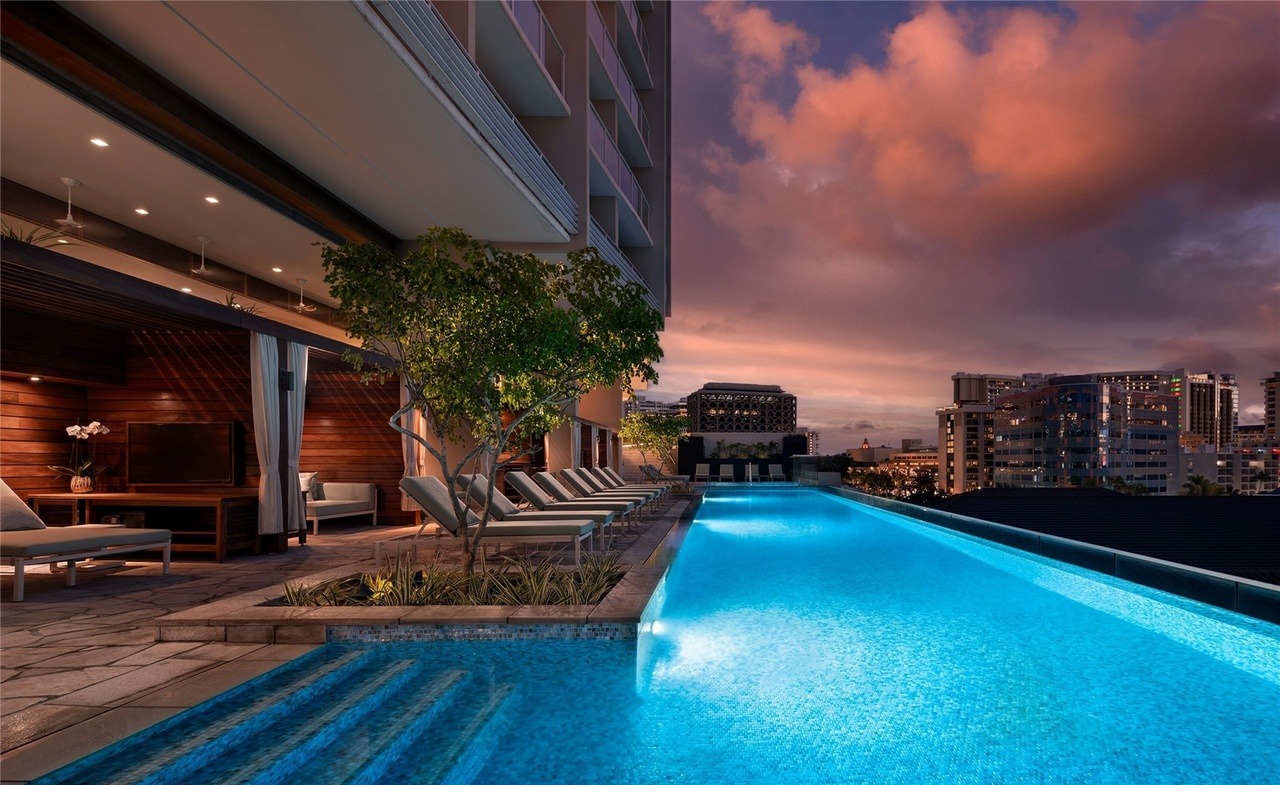 A stunning rooftop pool area showcasing desert modern luxury with a glowing infinity pool framed by warm wood architectural detailing, modern lounge seating, and a dramatic sunset sky. The space seamlessly blends indoor and outdoor living with integrated ambient lighting, strategic landscaping, and sophisticated material choices that create an editorial-worthy resort aesthetic.