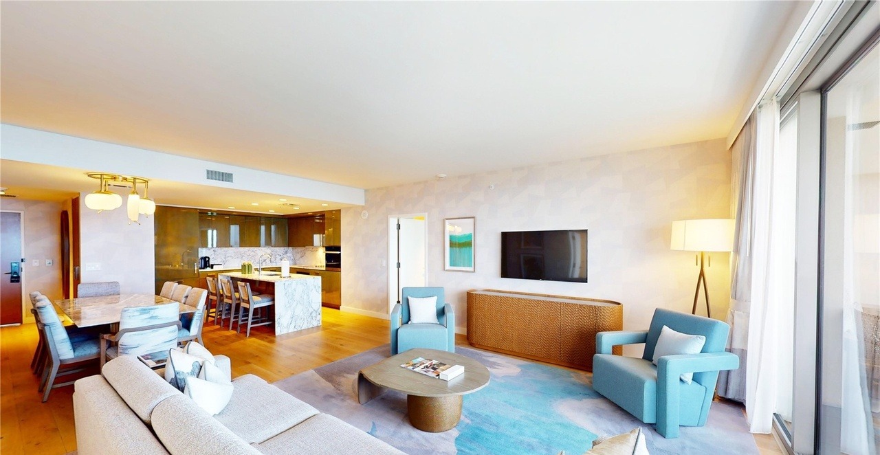 A sophisticated open-concept living and dining space featuring organic modern design with warm neutral tones, natural wood cabinetry, and marble accents balanced by teal upholstered seating and a woven rattan credenza. Floor-to-ceiling windows flood the space with abundant natural light, while carefully curated lighting and a minimalist oval coffee table create an airy yet refined coastal-influenced aesthetic.
