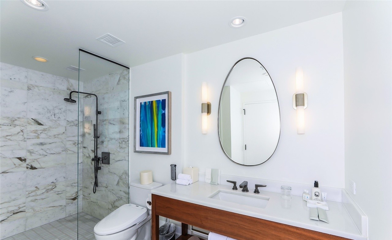 Floating VanityWalk In ShowerFrameless Glass ShowerOval Statement MirrorSconce LightingMarble Shower SurroundRecessed Lighting