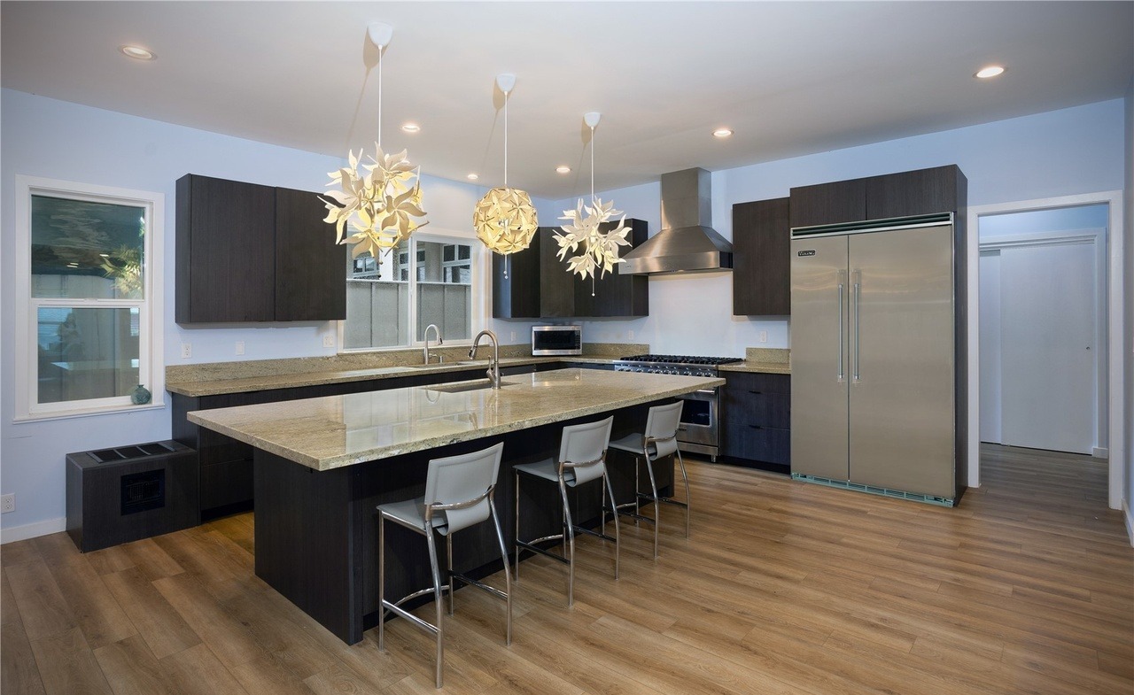 Waterfall IslandLarge IslandStatement LightingPendant LightingRange HoodGas CooktopBuilt In MicrowaveStainless Steel AppliancesOpen ConceptHigh CeilingsRecessed LightingFloor To Ceiling WindowsLarge Format Windows
