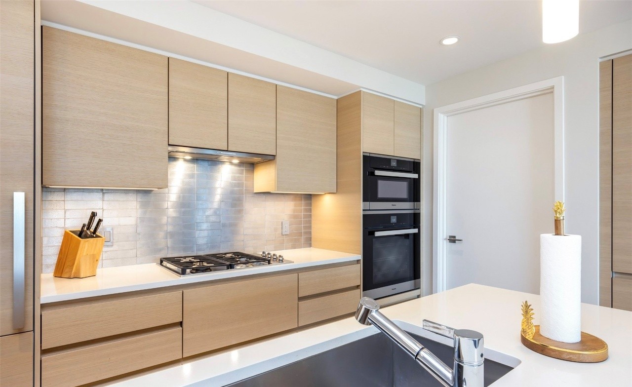 Countertop: QuartzCabinets: Flat PanelCabinet Color: Light WoodFlooring: HardwoodBacksplash: Subway TileCeiling: StandardTile: Subway Tile