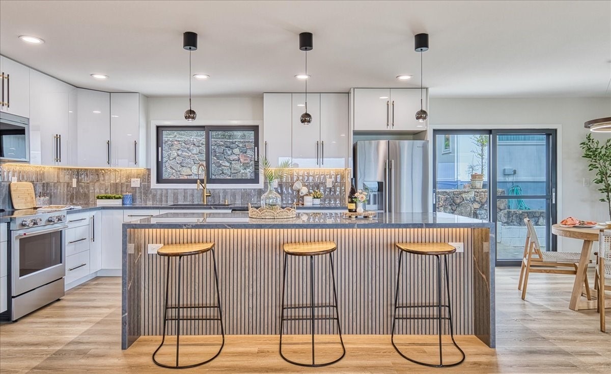 A stunning contemporary kitchen featuring a dramatic gray ribbed island with waterfall countertop, paired with crisp white cabinetry and warm hardwood flooring. The space seamlessly flows to outdoor living areas with expansive glass doors, abundant natural light, and a curated mix of brass and black metallic accents that elevate the sophisticated, modern aesthetic.