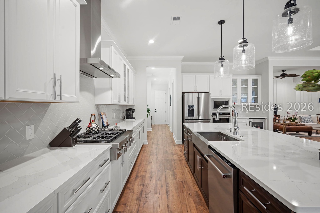 A stunning transitional kitchen featuring pristine white cabinetry, quartz countertops, and warm hardwood flooring that creates an elegant yet approachable aesthetic. The dual-island layout with integrated gas range, professional-grade appliances, and pendant lighting combines traditional millwork details with contemporary clean-line design, creating a sophisticated and airy culinary space perfect for modern luxury living.