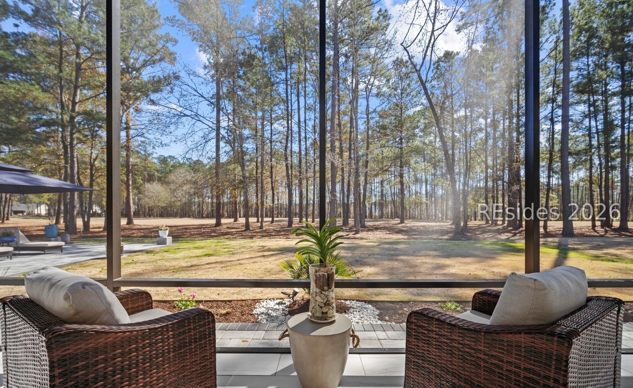A sophisticated covered patio overlooking a pine forest features minimalist woven rattan seating with neutral linen cushions and a polished concrete floor, exemplifying desert modern design with seamless indoor-outdoor living. The vast glass walls and high ceilings flood the space with natural light while maintaining an intimate, serene connection to nature through carefully curated furnishings and organic materials.
