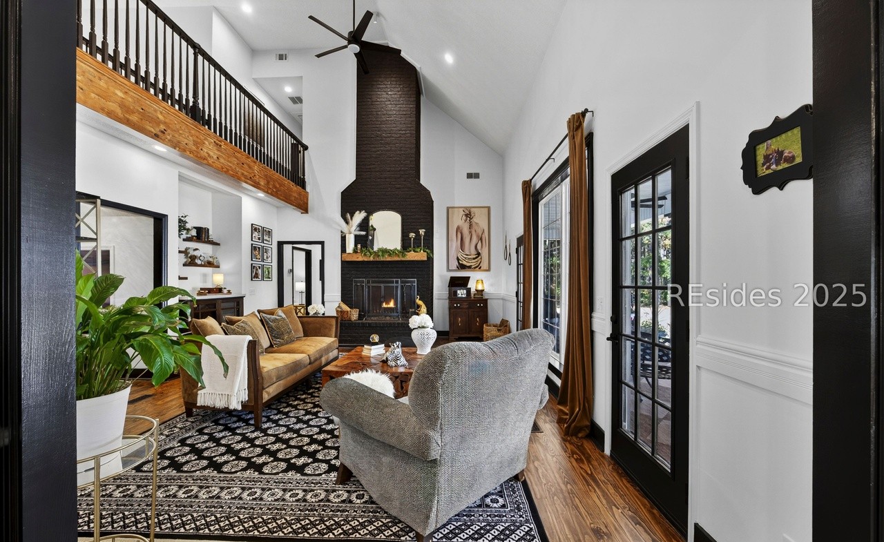 A sophisticated high-ceilinged living room blending transitional elegance with organic modern warmth, anchored by a dramatic black brick fireplace and accented with rich hardwood flooring, natural wood beams, and layered textures in neutral tones. Floor-to-ceiling windows flood the space with natural light, while curated furnishings and a patterned geometric rug create an inviting yet refined atmosphere.