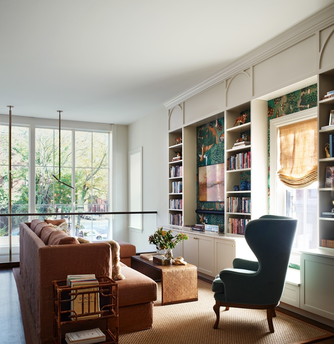 A sophisticated and serene library featuring custom cream-painted built-in shelving with integrated glass-front cabinetry, rich botanical wallpaper accents, and elegant traditional millwork including crown molding and arched doorways. The space masterfully blends transitional design elements—combining classical architectural details with contemporary furnishings in cognac leather and forest green velvet—bathed in abundant natural light from floor-to-ceiling windows overlooking verdant grounds.