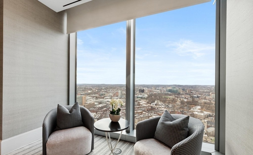 A sophisticated high-rise living room showcasing floor-to-ceiling windows with sweeping panoramic city views, furnished with minimalist curved seating in neutral tones. The restrained palette of whites, grays, and beiges emphasizes the dramatic urban landscape and abundant natural light, creating an serene yet opulent urban retreat.