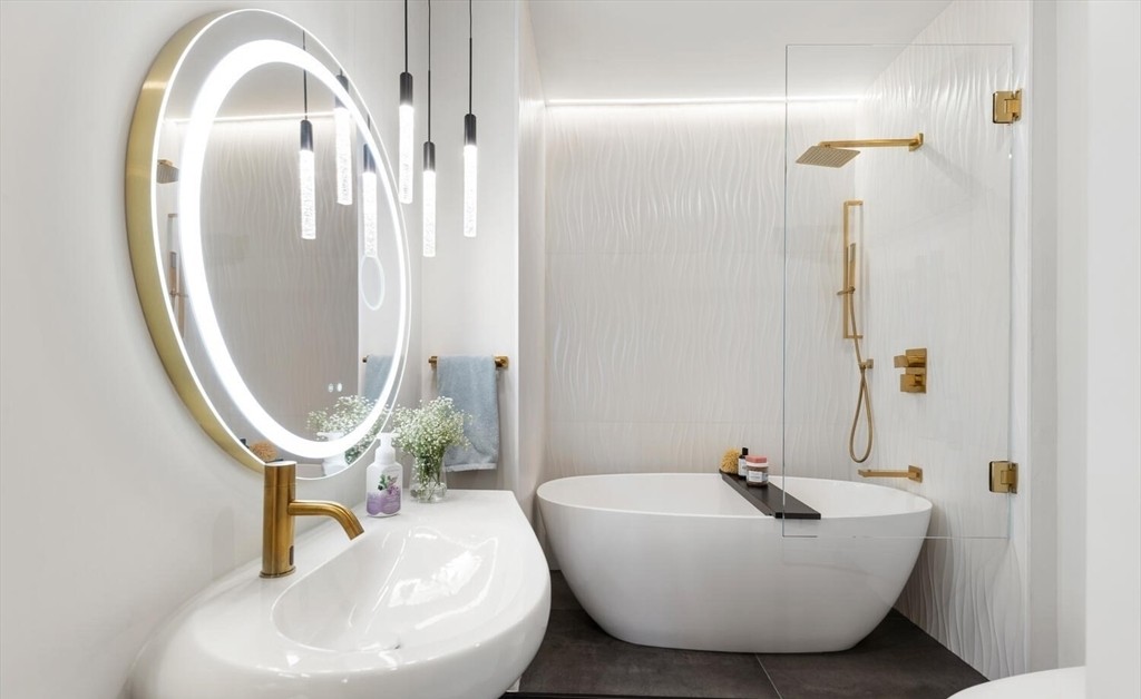 A contemporary luxury bathroom featuring a sculptural freestanding soaking tub and floating vanity with vessel sink, unified by clean lines, white large-format tilework, and a sophisticated brass hardware palette. The space achieves serene minimalism through restrained color use, statement LED mirror lighting, and seamless frameless glass shower enclosure with rainfall head, creating an editorial-quality spa-like retreat.