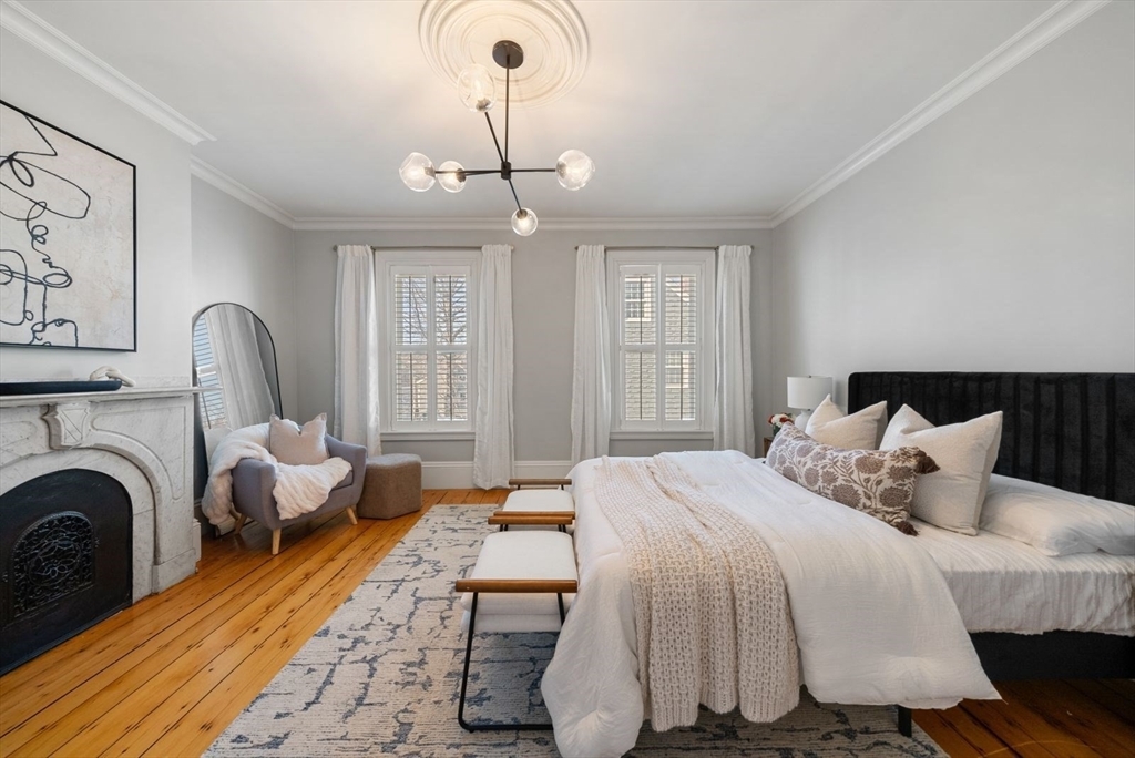 A serene primary bedroom masterfully blending traditional architectural details—crown molding, fireplace, wainscoting—with contemporary furnishings and a refined neutral palette of whites, grays, and creams. Abundant natural light from dual shuttered windows, elegant brass statement lighting, and thoughtfully layered textures create an inviting yet sophisticated sanctuary.