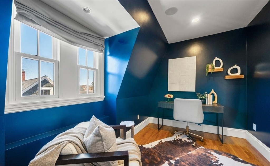 A sophisticated home office featuring a bold navy and teal color-blocked accent wall paired with crisp white trim and wainscoting, creating a dramatic yet refined workspace. Large casement windows flood the room with natural light, while brass shelving, warm wood flooring, and curated accessories bring warmth and luxurious detail to this contemporary transitional design.