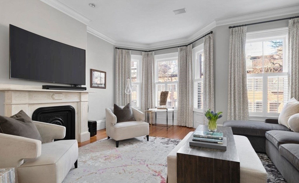 A sophisticated living room featuring elegant transitional design with East Coast refinement, anchored by a marble fireplace with black metal surround and complemented by floor-to-ceiling bay windows dressed in tailored linen drapery. The neutral palette of creams, whites, and grays is elevated through thoughtful material choices, quality upholstery, and polished architectural details including crown molding and custom millwork.