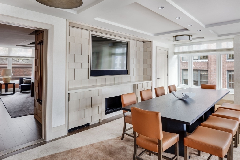 A sophisticated media and dining room featuring custom cream-colored board-and-batten wall paneling with a coffered ceiling and integrated flat-screen TV above a fireplace. The space balances formal architectural millwork with modern furnishings, including a charcoal dining table, cognac leather chairs, and abundant natural light from large windows overlooking an urban courtyard.