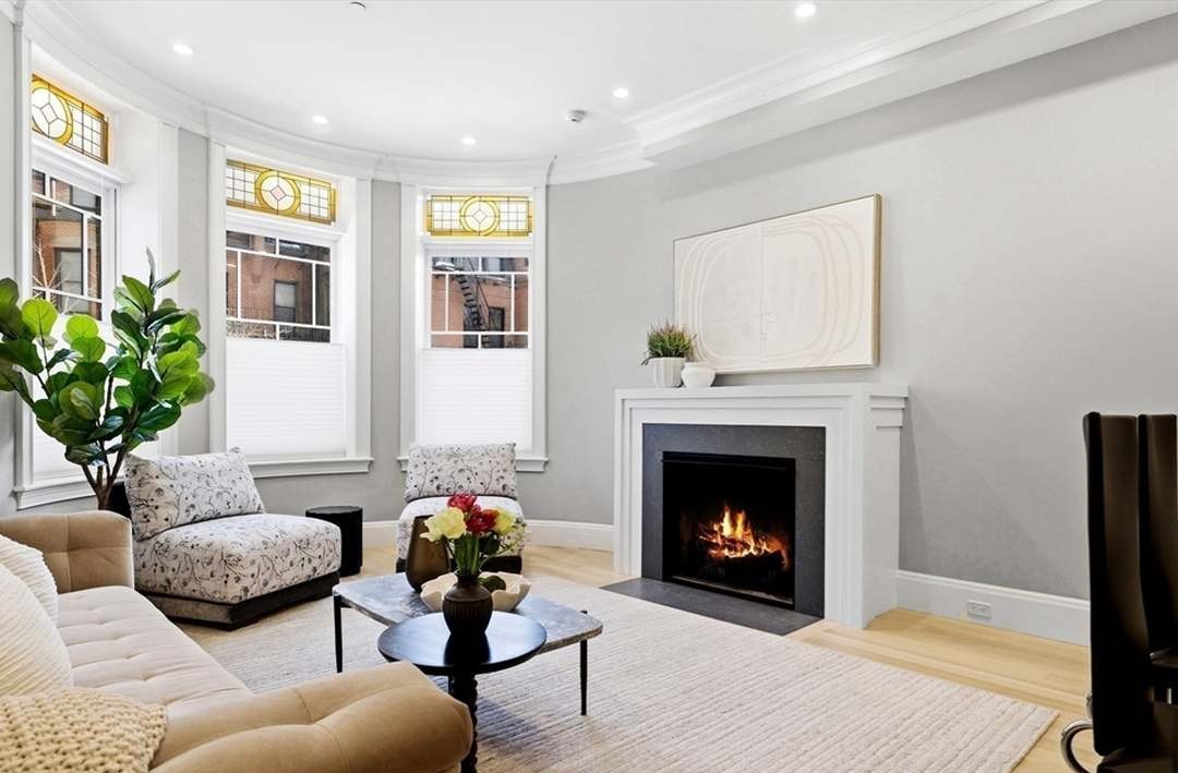 A sophisticated living room featuring traditional architectural details—coffered ceiling, crown molding, and stained glass windows—paired with clean-lined modern furnishings and a neutral palette. The active fireplace, abundant natural light, and refined material choices create an elevated yet comfortable luxury retreat.