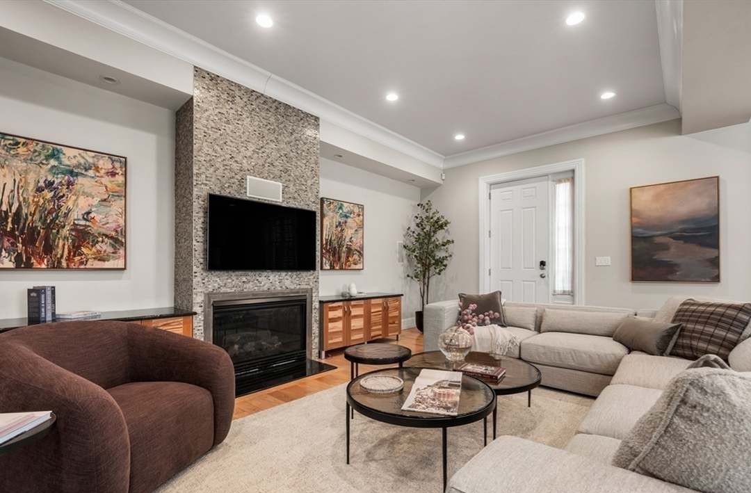 A sophisticated transitional family room anchored by a dramatic stone fireplace with black-framed television, featuring custom millwork, coffered ceilings, and warm neutral furnishings in cream and taupe. The space expertly blends traditional architectural details with contemporary clean-lined furniture and curated artwork, creating an inviting yet refined retreat.