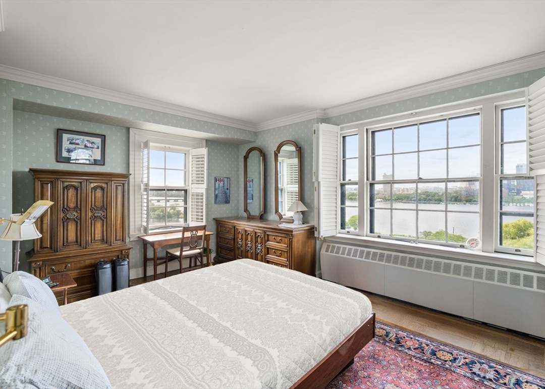 A serene primary bedroom suite featuring sophisticated transitional design with sage green damask wallpaper, dark wood period furniture, and expansive waterfront windows providing abundant natural light. The room exemplifies understated elegance with quality antique furnishings, brass hardware accents, and classic molding details paired with contemporary proportions and updated finishes.