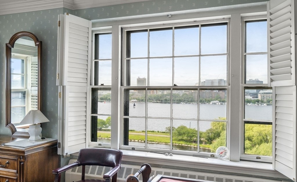 A sophisticated waterfront bedroom featuring expansive bay windows with spectacular river views, elegant plantation shutters, and refined traditional details including crown molding and custom millwork. The refined color palette of grays, whites, and cream paired with warm wood furnishings and brass accents creates a serene, luxurious retreat with impeccable light control and waterfront elegance.