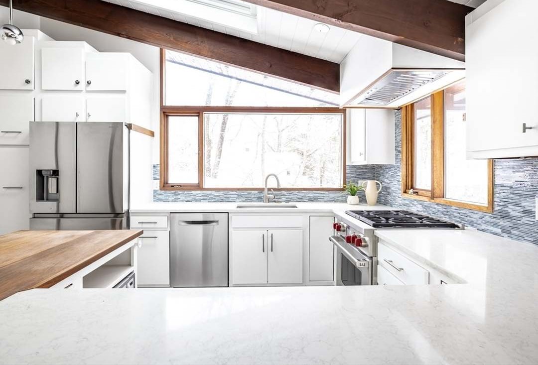 A bright, open-concept kitchen featuring a sophisticated blend of white shaker cabinetry, warm wood accents, and sleek quartz countertops, anchored by a striking waterfall island and framed by abundant natural light from expansive windows. The exposed beam ceiling and blue-gray glass mosaic backsplash add architectural interest and warmth to this transitional luxury space.