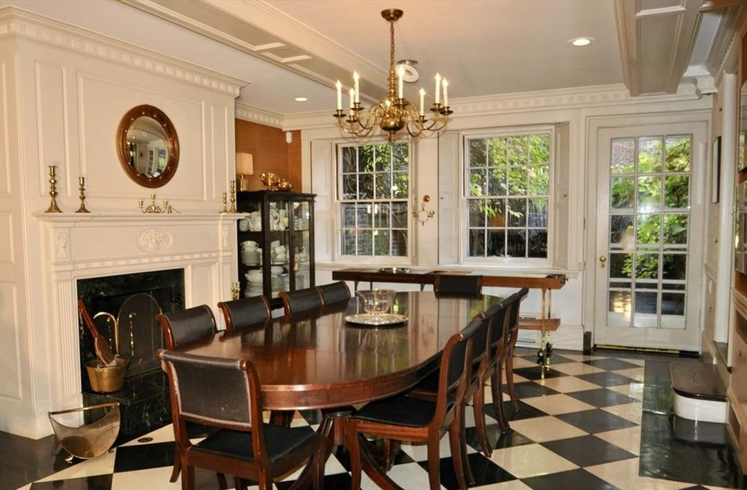 A sophisticated formal dining room exemplifying timeless transitional design with classical architectural details—coffered ceiling, white wainscoting, crown molding, and a marble checkerboard floor—paired with elegant dark wood furniture and brass-accented lighting. Floor-to-ceiling windows and a working fireplace with built-in shelving create a grand yet inviting atmosphere perfect for refined entertaining.