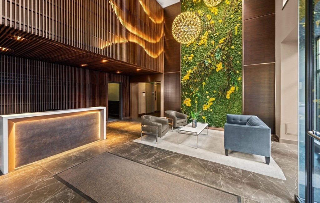 A sophisticated contemporary entryway showcasing premium materials and biophilic design, featuring warm walnut wood-slat wall paneling, polished marble flooring, and a striking green living wall with yellow accent florals. Brass-accented statement lighting and ambient under-cabinet illumination create an inviting, upscale first impression with meticulous attention to material composition and luxury detailing.