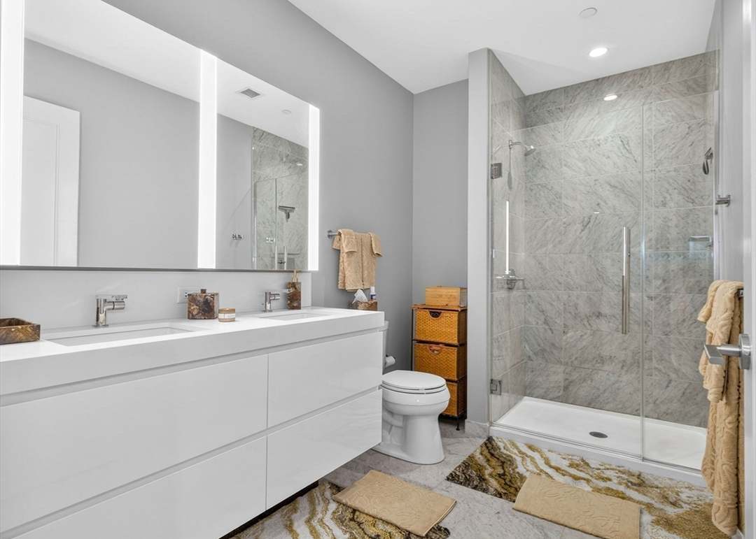 A sophisticated primary bathroom featuring a clean-lined double vanity with lighted mirrors, premium marble-look large-format tile shower enclosure, and soft gray walls that create a serene spa-like atmosphere. The space masterfully blends contemporary minimalism with warm natural textures through wooden storage and warm-toned towels, achieving a modern transitional aesthetic with exceptional finishes and thoughtful lighting design.