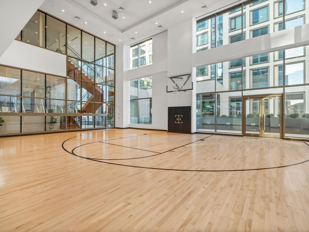A sophisticated ultra-luxury private gymnasium featuring a full basketball court with professional hardwood flooring, floor-to-ceiling glazed walls flooding the space with natural light, and a mezzanine level with glass railings overlooking the court. The clean modernist design with white walls, minimal ornamentation, and bronze accents creates a serene, high-performance athletic sanctuary.