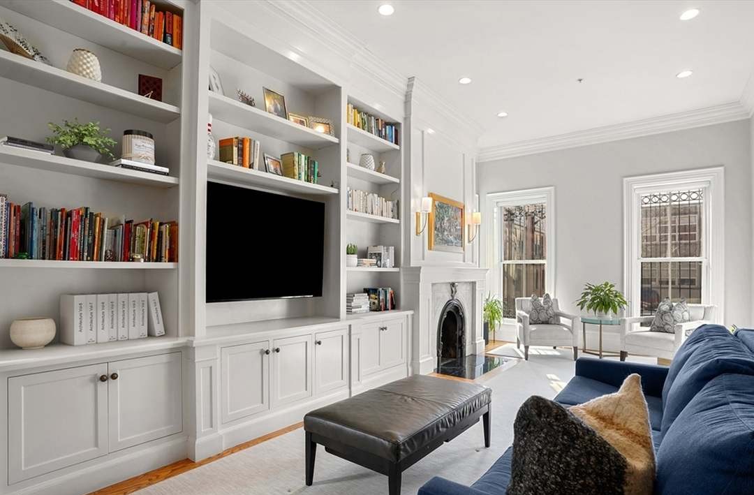 A sophisticated family room featuring extensive custom white built-in shelving with a central fireplace and flat-screen television, anchored by a navy upholstered sofa and complemented by abundant natural light from large windows. The design blends traditional architectural details like crown molding and wainscoting with contemporary furnishings and clean-lined cabinetry, creating an elegant yet approachable transitional aesthetic with a New England Hamptons sensibility.