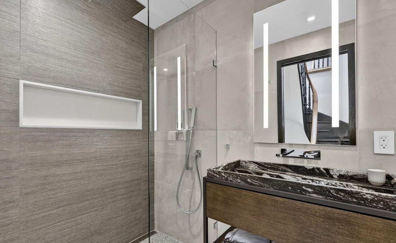 Floating VanityFrameless Glass ShowerWalk In ShowerLighted MirrorRecessed LightingNiche StorageRainfall Showerhead