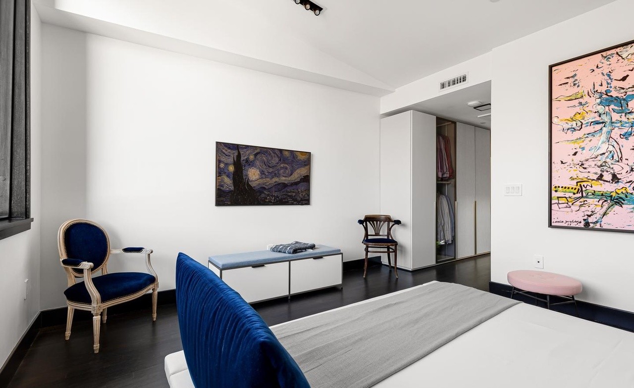 A sophisticated primary bedroom suite featuring a striking palette of navy blue, white, and soft pink accents, anchored by curated contemporary art and elegant transitional furnishings. The space combines high-end materials with layered textures—plush velvet seating, polished brass hardware, and dark hardwood flooring—creating a refined, gallery-like bedroom retreat with gallery-quality artwork and bespoke styling.