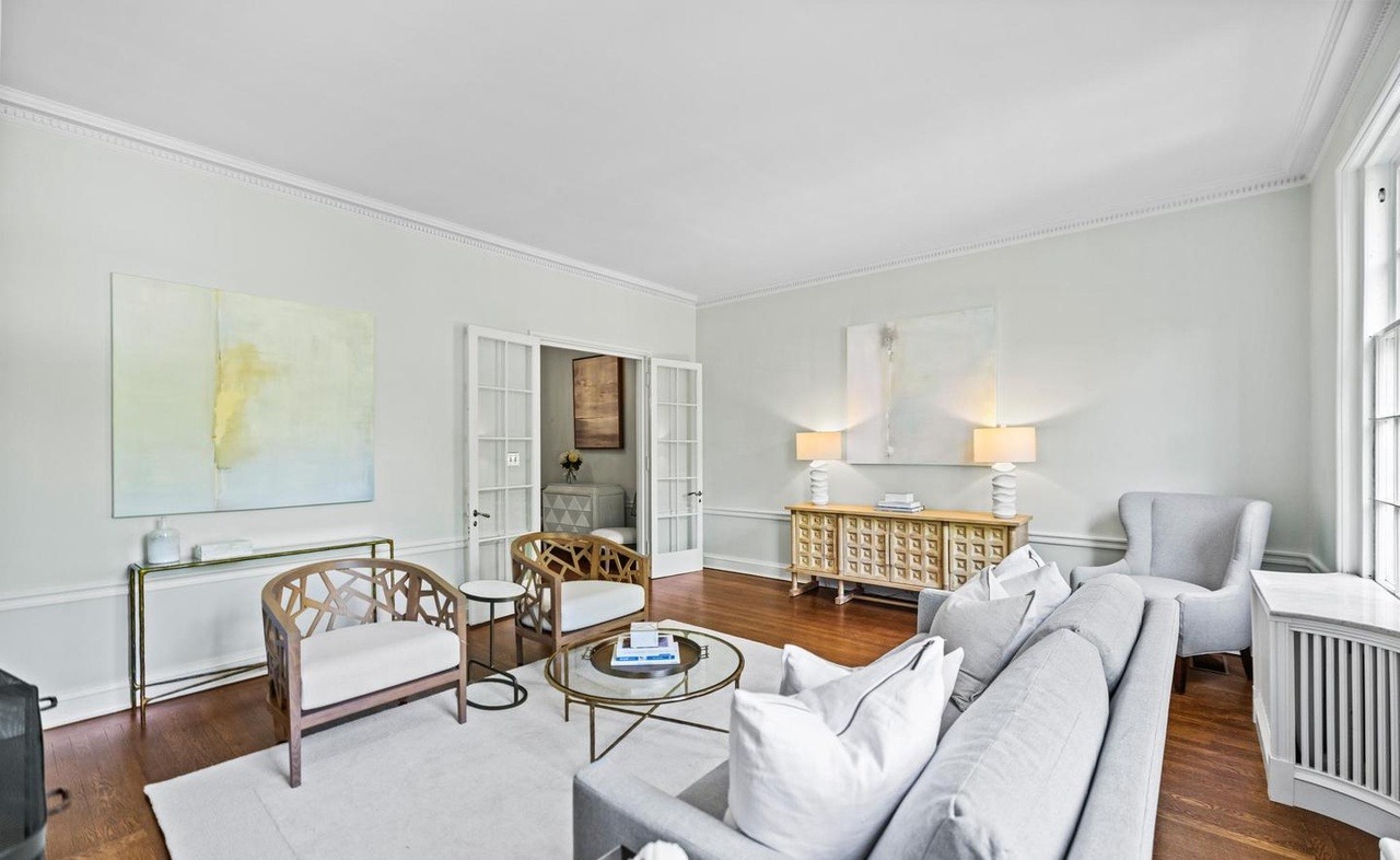 A serene, classically elegant living room featuring soft cream and white tones complemented by warm hardwood flooring and brass-accented furnishings, with architectural details including wainscoting, crown molding, and abundant natural light creating a sophisticated, airy retreat.