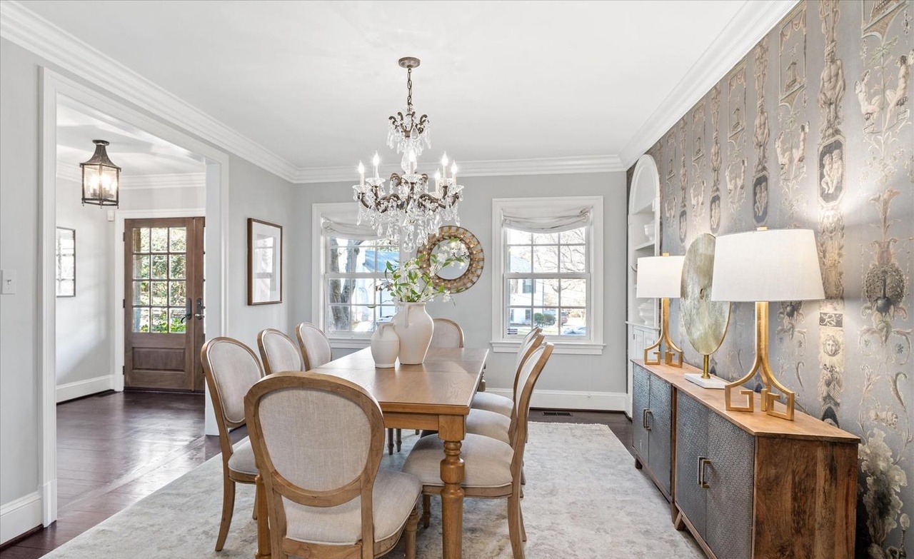 An elegant formal dining room featuring a refined transitional design with classic architectural details, soft gray-and-cream palette, and a striking hand-painted toile wallpaper accent wall. The space combines traditional millwork and crown molding with contemporary furnishings, anchored by a crystal chandelier and brass-accented lighting that creates a warm, sophisticated atmosphere.