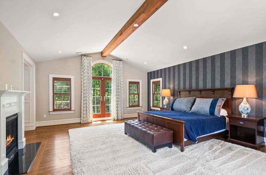 A sophisticated primary bedroom suite featuring a dramatic navy-striped accent wall, exposed timber beam, and abundant natural light from multiple French doors and arched windows. The space seamlessly blends transitional architecture with organic modern furnishings, anchored by a rich wood bed frame, warm hardwood flooring, and curated lighting that creates an intimate yet grand atmosphere.