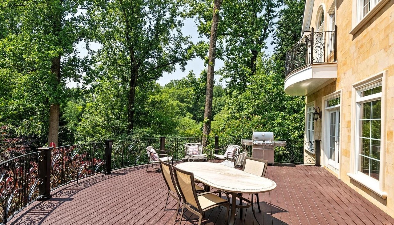 A sweeping elevated patio overlooking mature forest landscape, featuring a limestone mansion façade, decorative wrought-iron railing, and sophisticated outdoor living zones with dining and lounge areas. The space exemplifies luxury resort-style entertaining with high-end materials, professional finishes, and commanding natural views.