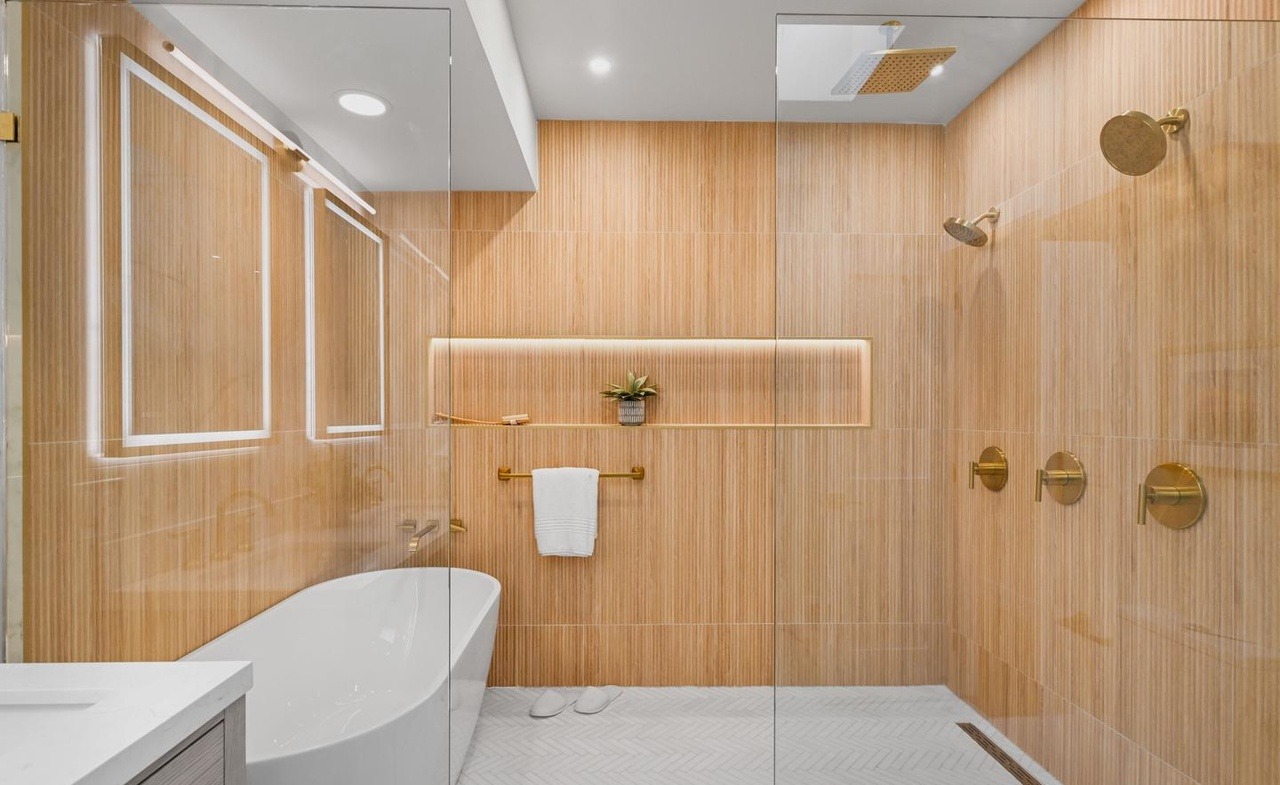 A stunning contemporary primary bathroom featuring warm wood-grain porcelain tile walls, a luxurious freestanding soaking tub, and a generous walk-in frameless glass shower with brass fixtures. The design balances organic warmth with modern minimalism, elevated by integrated niche shelving, recessed lighting with a statement round brass fixture, and a floating vanity that creates an airy, sophisticated aesthetic.