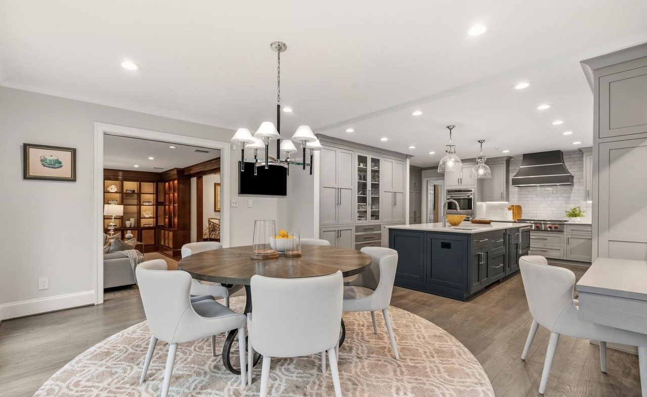 A stunning open-concept kitchen featuring a sophisticated two-tone cabinetry scheme with light gray and navy blue elements, complemented by a dramatic waterfall-edge island and abundant natural light. The space seamlessly integrates dining and living areas with high-end finishes, professional appliances, and elegant transitional design elements including crown molding and a striking black multi-arm chandelier.