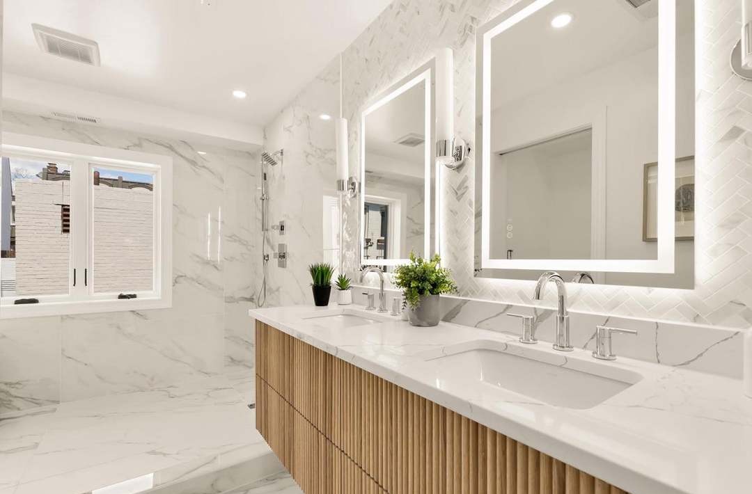 Double VanityFloating VanityWalk In ShowerFrameless Glass ShowerDouble FaucetLighted MirrorsMarble SurroundHigh CeilingsStatement Lighting