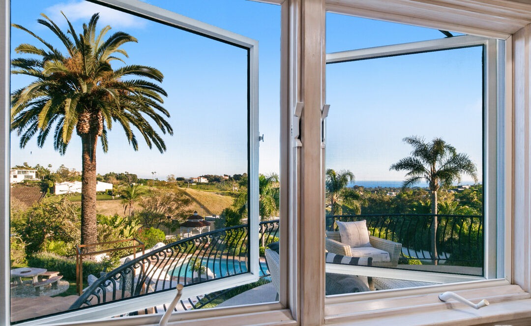 A sophisticated Southern California coastal terrace captured through expansive floor-to-ceiling glass walls, offering breathtaking ocean and hillside vistas framed by mature palm trees. The space exemplifies organic modern design with minimalist furnishings, serene neutral tones, and seamless indoor-outdoor integration typical of high-end Malibu or Pacific Palisades luxury estates.