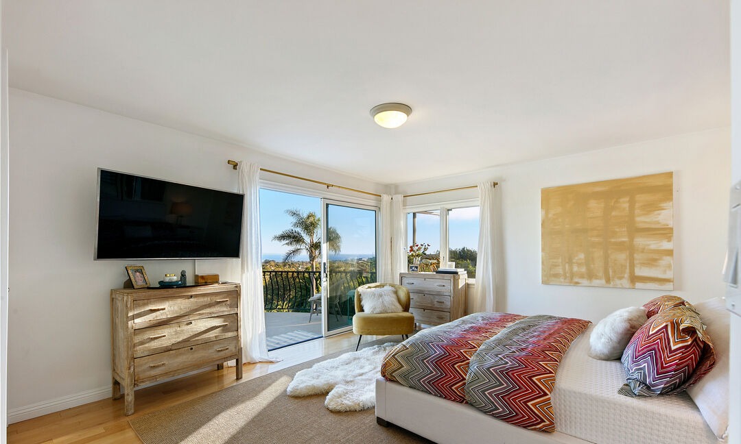 A bright, sophisticated primary bedroom suite with floor-to-ceiling windows and ocean views, featuring a warm modern aesthetic with natural wood furnishings, soft linens, and patterned accents. The space balances coastal airiness with contemporary luxury through carefully curated furniture and an open layout that connects the sleeping and seating areas.