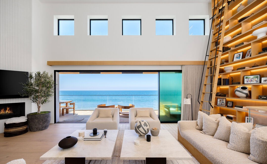 A stunning waterfront living room exemplifying coastal organic modern design, featuring expansive floor-to-ceiling ocean views, warm natural wood shelving with integrated lighting, and floating cream linen furniture arranged around marble tables. The soaring white walls, minimalist fireplace, and seamless indoor-outdoor flow create a serene yet sophisticated sanctuary with museum-quality materiality and composition.