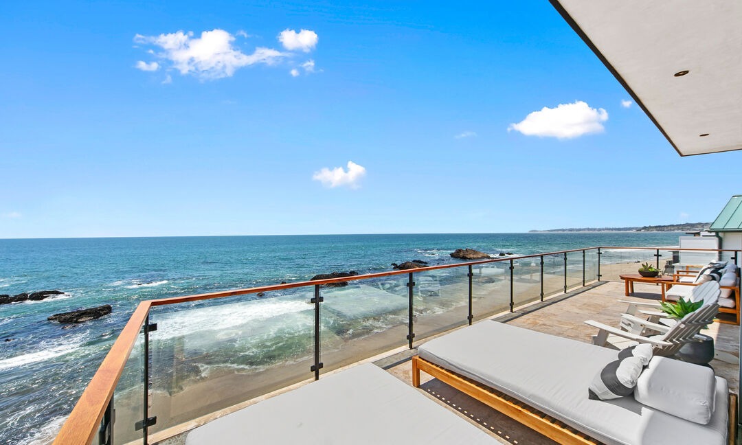A stunning oceanfront patio featuring a seamless indoor-outdoor living experience with glass railings, natural wood accents, and pristine white lounge seating overlooking a turquoise sea and sandy beach. The minimalist design emphasizes the dramatic waterfront views while maintaining sophisticated coastal elegance with warm wood tones, crisp whites, and subtle black metal detailing.