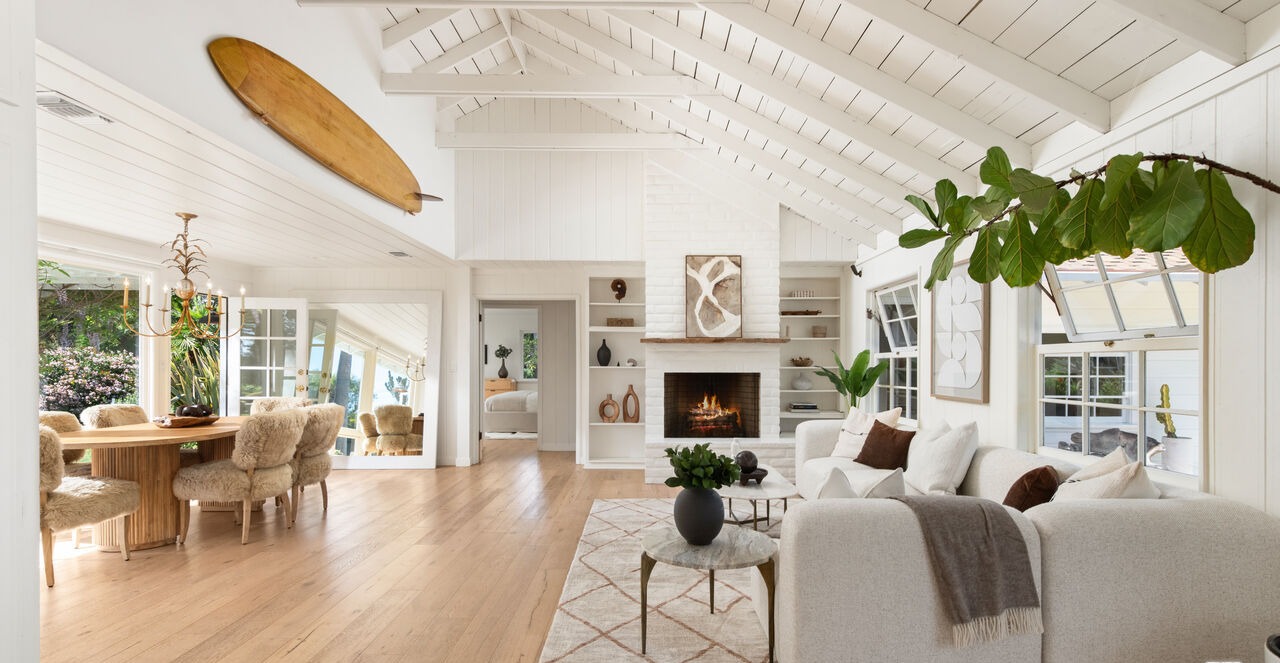 A sophisticated open-concept living room featuring white shiplap walls, exposed wood-plank ceilings, and abundant natural light from floor-to-ceiling windows that create an airy, serene environment. The space seamlessly blends transitional and organic modern design through natural wood furnishings, a central fireplace with custom built-in shelving, and carefully curated botanical accents that emphasize warmth and casual luxury.