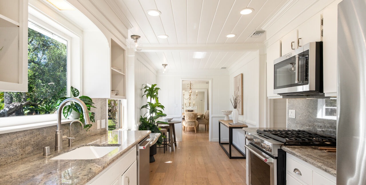 This light-filled galley kitchen features classic transitional design with clean white cabinetry, warm granite countertops, and a sophisticated stone backsplash, unified by abundant natural light from oversized windows. The open-concept layout, wood-plank ceiling, and carefully curated greenery create a serene, warm luxury atmosphere that balances contemporary functionality with timeless elegance.