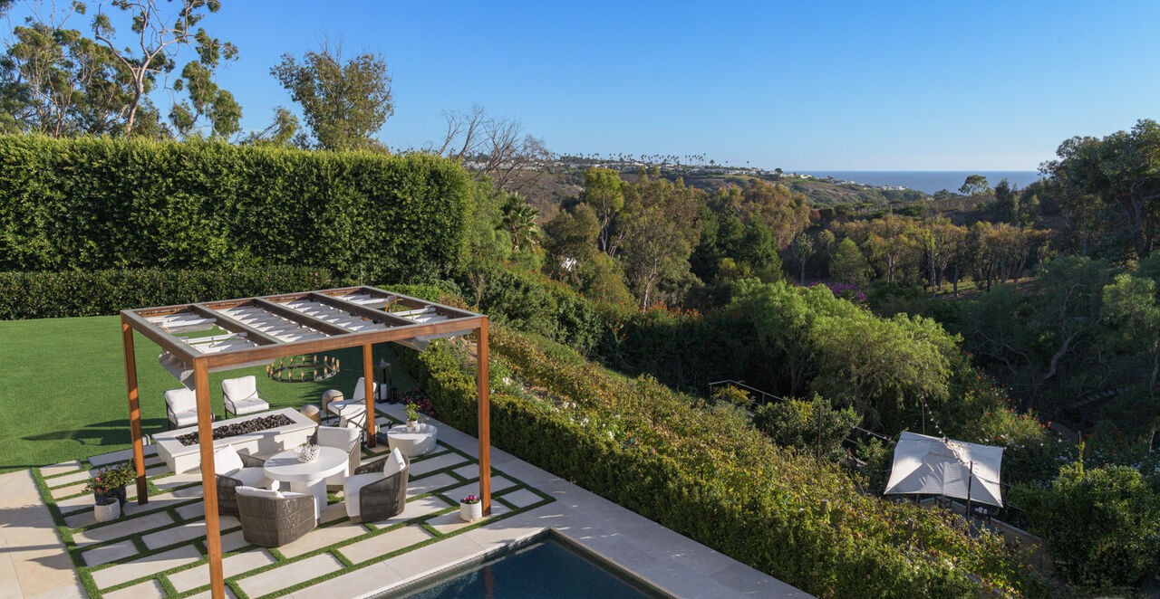 A stunning ultra-luxury Southern California poolside retreat featuring a warm-toned concrete entertainment deck anchored by a wooden pergola with integrated solar panels, sophisticated woven lounge furniture arranged around a fire pit, and panoramic coastal views framed by mature eucalyptus groves. The space seamlessly integrates indoor-outdoor living with strategic landscaping, premium furnishings, and meticulous design detailing that epitomizes contemporary desert-modern luxury.