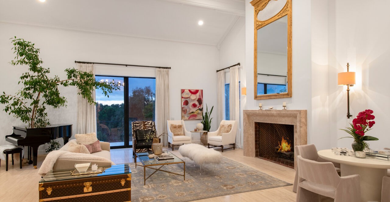 An expansive, light-filled living room showcasing sophisticated transitional design with organic modern warmth, featuring a travertine fireplace, layered cream and beige upholstered seating, a grand piano, and abundant natural light from floor-to-ceiling windows overlooking landscape views. The space masterfully blends traditional architectural elements like crown molding with contemporary furnishings and carefully curated gold and warm accent tones.