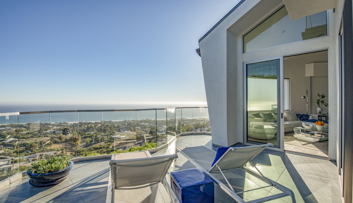 A sprawling contemporary patio perched high above a coastal landscape, featuring frameless glass railings that maximize unobstructed ocean and landscape views. The space seamlessly blends indoor-outdoor living with clean modern furnishings, polished concrete flooring, and abundant natural light, epitomizing California luxury design.