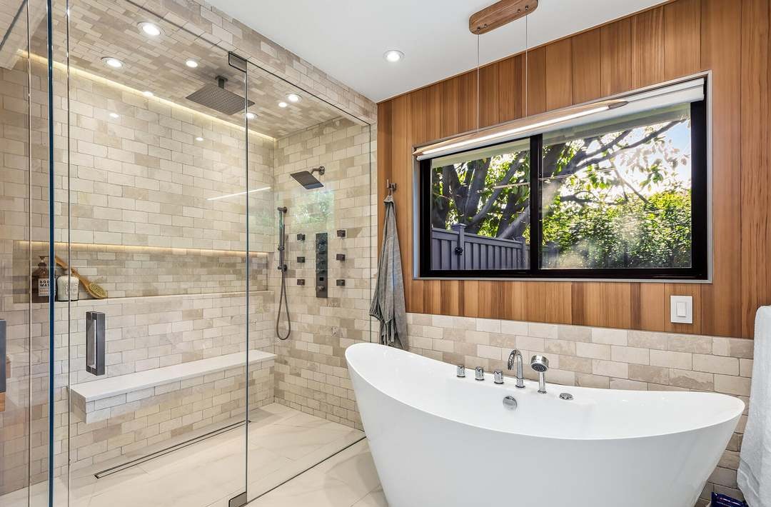 A sophisticated spa-inspired primary bathroom combining warm wood paneling with clean-lined subway tile, anchored by a sculptural freestanding tub positioned to capture abundant natural light from expansive windows overlooking mature landscaping. The frameless glass walk-in shower, premium fixtures, and seamless integration of natural materials create a serene, resort-like sanctuary that balances modern minimalism with organic warmth.